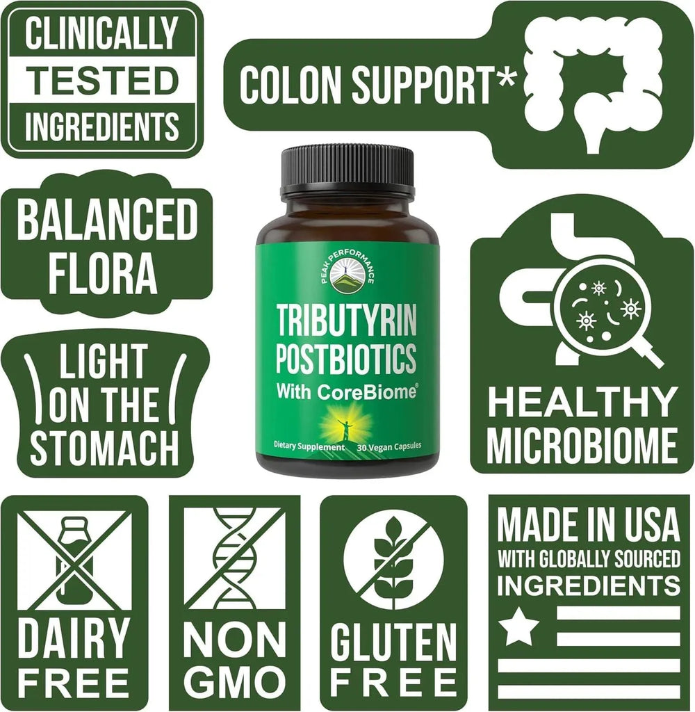¿Qué quiere decir esto? Peak Performance CoreBiome Tributyrin Postbiotics es el suplemento en cápsulas postbiótico definitivo. CoreBiome tiene extracto de tributirina al 55 % y, respaldado por estudios clínicos, respalda la salud inmunológica al promover un microbioma saludable, respalda la flora equilibrada, ayuda a respaldar la salud intestinal y digestiva, gastrointestinal y las paredes intestinales.
