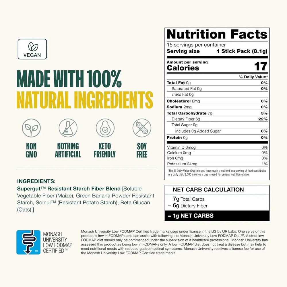 NO ES TU FIBRA ORDINARIA: El secreto de Supergut es una poderosa fibra prebiótica llamada Almidón Resistente.