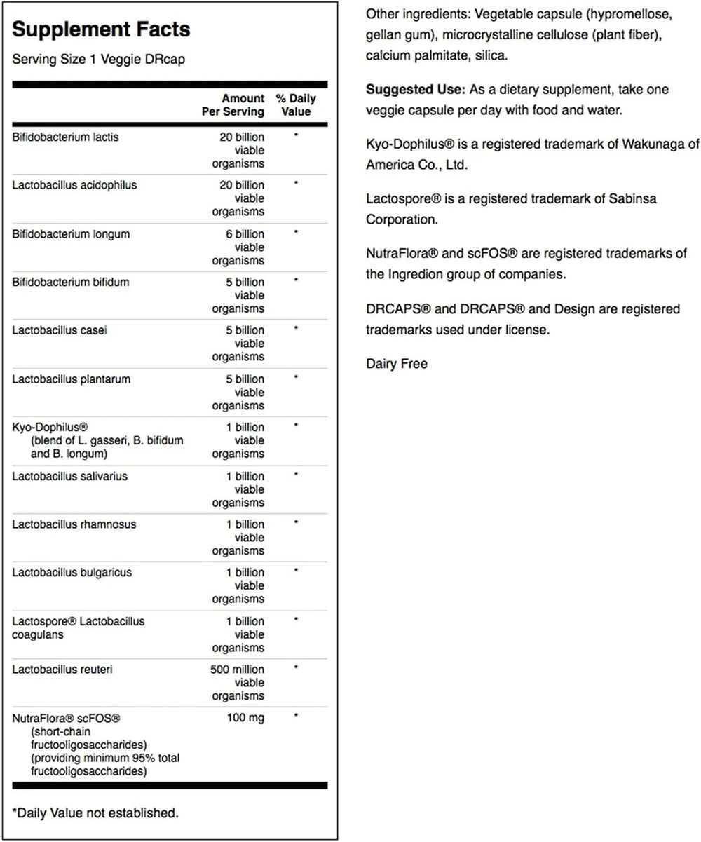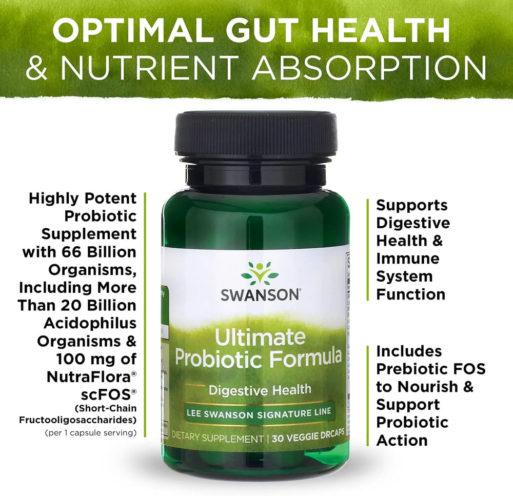 Los probióticos son bacterias amigables con el intestino que ayudan a la digestión natural y la absorción de nutrientes del cuerpo. Los suplementos probióticos ayudan a promover un tracto gastrointestinal saludable al mantener un equilibrio saludable de bacterias amigables, que ayudan a la digestión al ayudar a convertir los alimentos en energía. Para optimizar la acción de los probióticos, Swanson Ultimate Probiotic Formula también viene con 100 mg de prebióticos para nutrir las bacterias intestinales amigables y ayudarlas a prosperar.