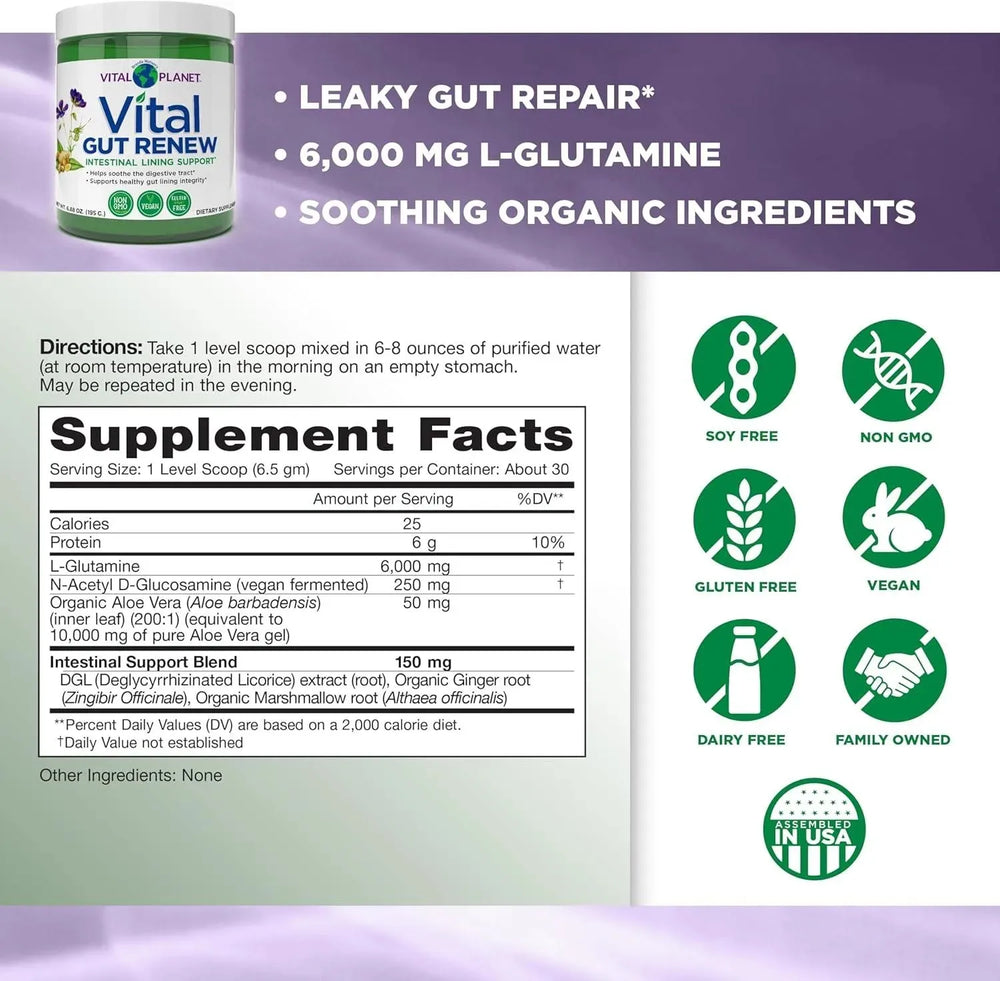 Soporte avanzado para el intestino permeable: Vital Gut Renew es una fórmula avanzada para apoyar la reparación del intestino permeable, promover la integridad saludable del revestimiento intestinal y ayudar a calmar el tracto digestivo. Formulado por expertos, contiene ingredientes clave conocidos por apoyar la salud del revestimiento intestinal: 6000 mg de L-glutamina, hasta 2 veces más que las principales fórmulas de apoyo al revestimiento intestinal, aloe vera orgánico, N-acetil D-glucosamina, raíz de malvavisco orgánica, raíz de jengibre orgánica, y extractos de raíz de regaliz DGL (desglicirricinados).