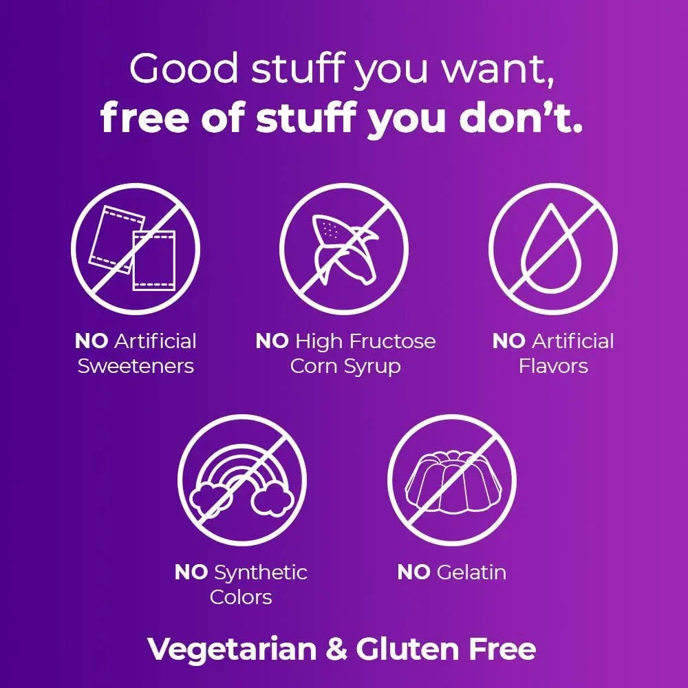 Sin jarabe de maíz con alto contenido de fructosa, colorantes o sabores artificiales, colorantes sintéticos, gelatina o aceite de palma