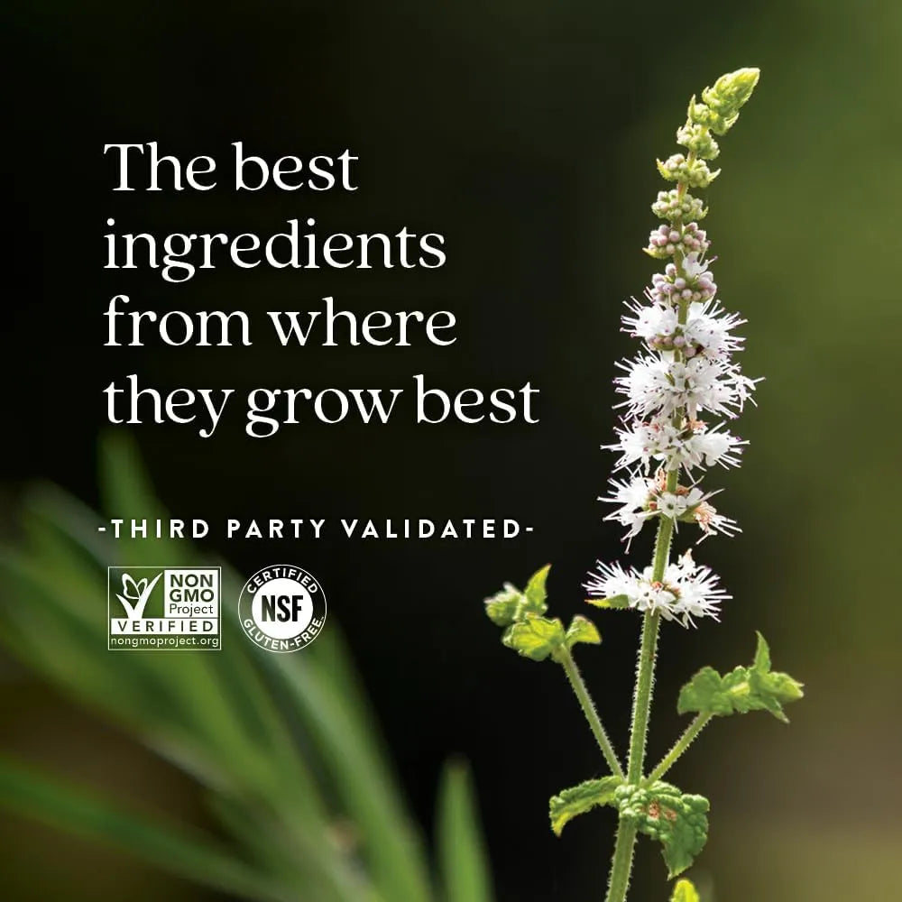 Sin hormonas ni estrógenos, verificado por el Proyecto Non-GMO, certificado sin gluten por la NSF, 100 % vegetariano, sin rellenos sintéticos, sin conservantes artificiales, sin saborizantes ni colorantes artificiales.