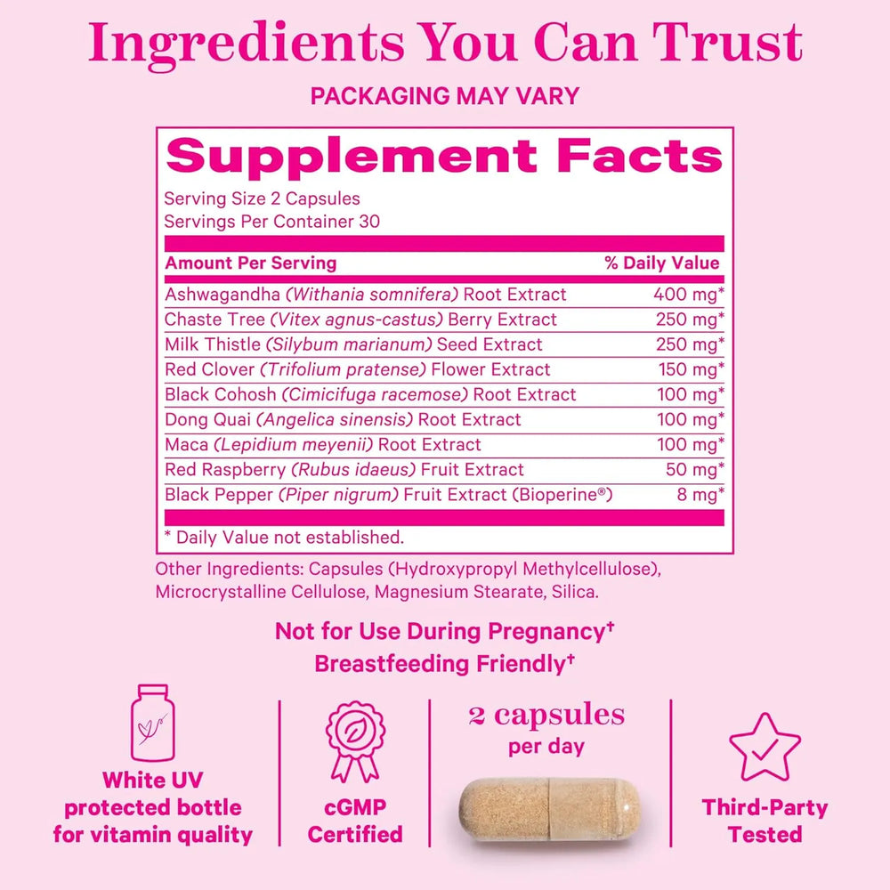 Una de cada nueve mujeres se someterá a una histerectomía, lo que significa que experimentará la menopausia antes, ¡lo que lo convierte en un producto esencial para la recuperación de la histerectomía! Experimente un apoyo para la menopausia con múltiples síntomas durante esta etapa de la vida con nuestra fórmula sin hormonas con ashwagandha, raíz de cimicífuga, dong quai, baya del árbol casto (también conocido como vitex, la "hierba de la mujer"), trébol rojo, cardo mariano, raíz de maca, frambuesa roja y extracto de pimienta negra.