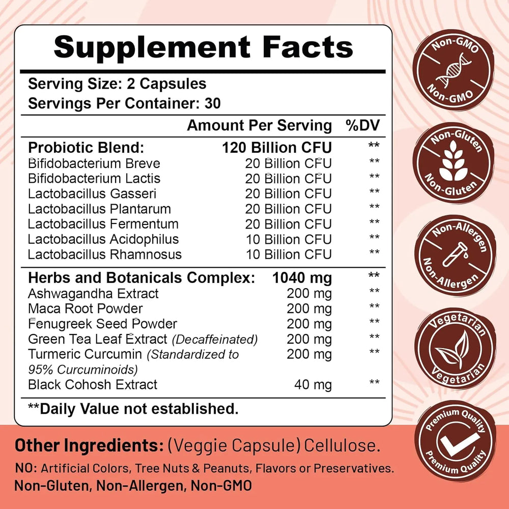 • Complejo 13 en 1 de hierbas y botánicos: Infundido con ashwagandha, raíz de maca, semillas de fenogreco, hojas de té verde, cúrcuma y curcumina, y cimicífuga para regular las hormonas y el ciclo menstrual femenino. Y 120 mil millones de UFC de probióticos para mujeres, complejo 13 en 1 de hierbas y botánicos para aliviar la menopausia hormonal, los sofocos, los sudores nocturnos, los trastornos del sueño y los cambios de humor.