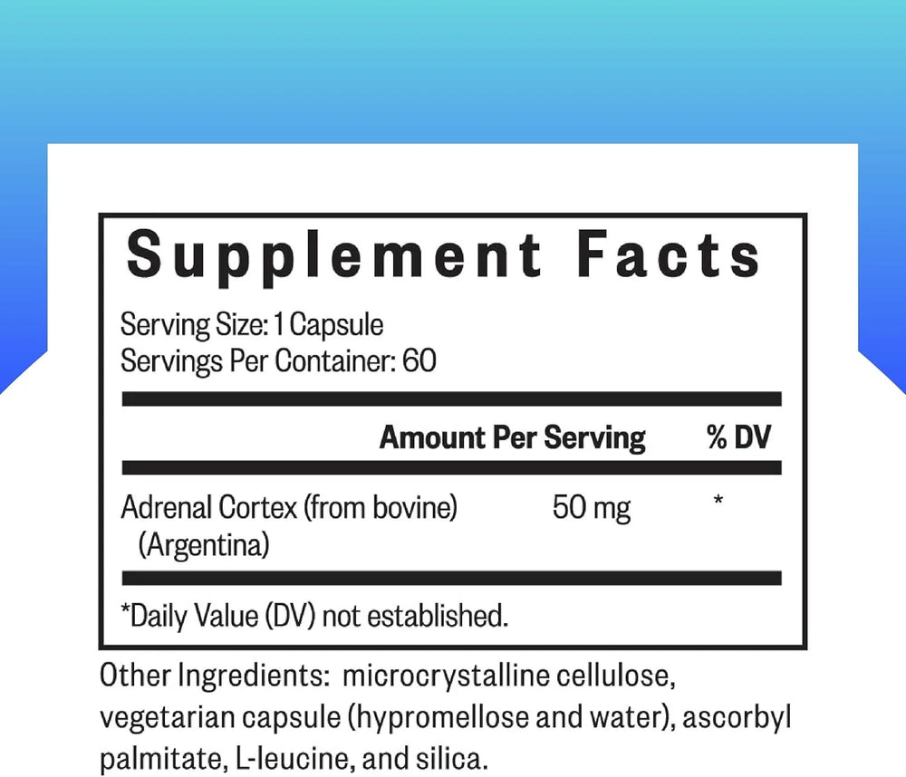 • Apoyo específico: Corteza suprarrenal proporciona 50 mg de corteza suprarrenal de alta calidad por cápsula. El tejido glandular liofilizado proviene de vacas argentinas alimentadas con pasto, libres de hormonas sintéticas.