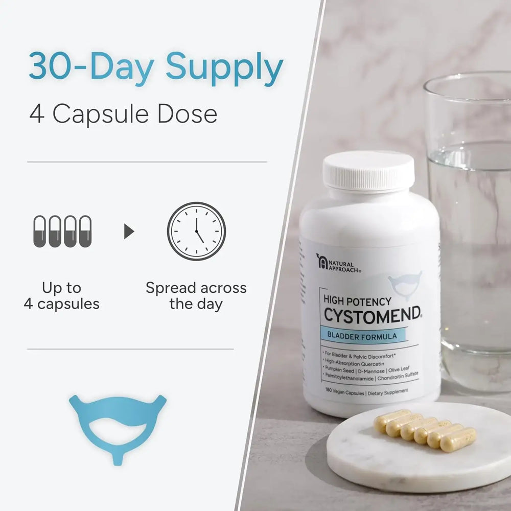 APOYO SUPERIOR PARA LA VEJIGA: CYSTOMEND está formulado por expertos con una selección de ingredientes excepcionales conocidos por sus efectos beneficiosos para la salud de la vejiga. Se presenta en una dosis de 4 cápsulas.