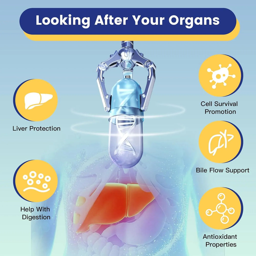 • Apoyo para la salud y la reparación del hígado: Investigaciones científicas actuales demuestran que el TUDCA puede mejorar el flujo biliar en el hígado y la vesícula biliar. Puede ayudar a proteger las células hepáticas de la acumulación de bilis tóxica, mantener los procesos digestivos y prevenir el daño hepático.