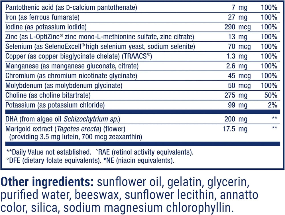 BRINDE A SU HIJO UNA VENTAJA NUTRICIONAL: Las mujeres embarazadas, que buscan quedar embarazadas o que están amamantando tienen necesidades nutricionales únicas. Este suplemento con base científica proporciona las dosis recomendadas más recientes de vitaminas y minerales, además de nutrientes como DHA omega-3, colina, luteína y zeaxantina, tanto para la madre como para el bebé.