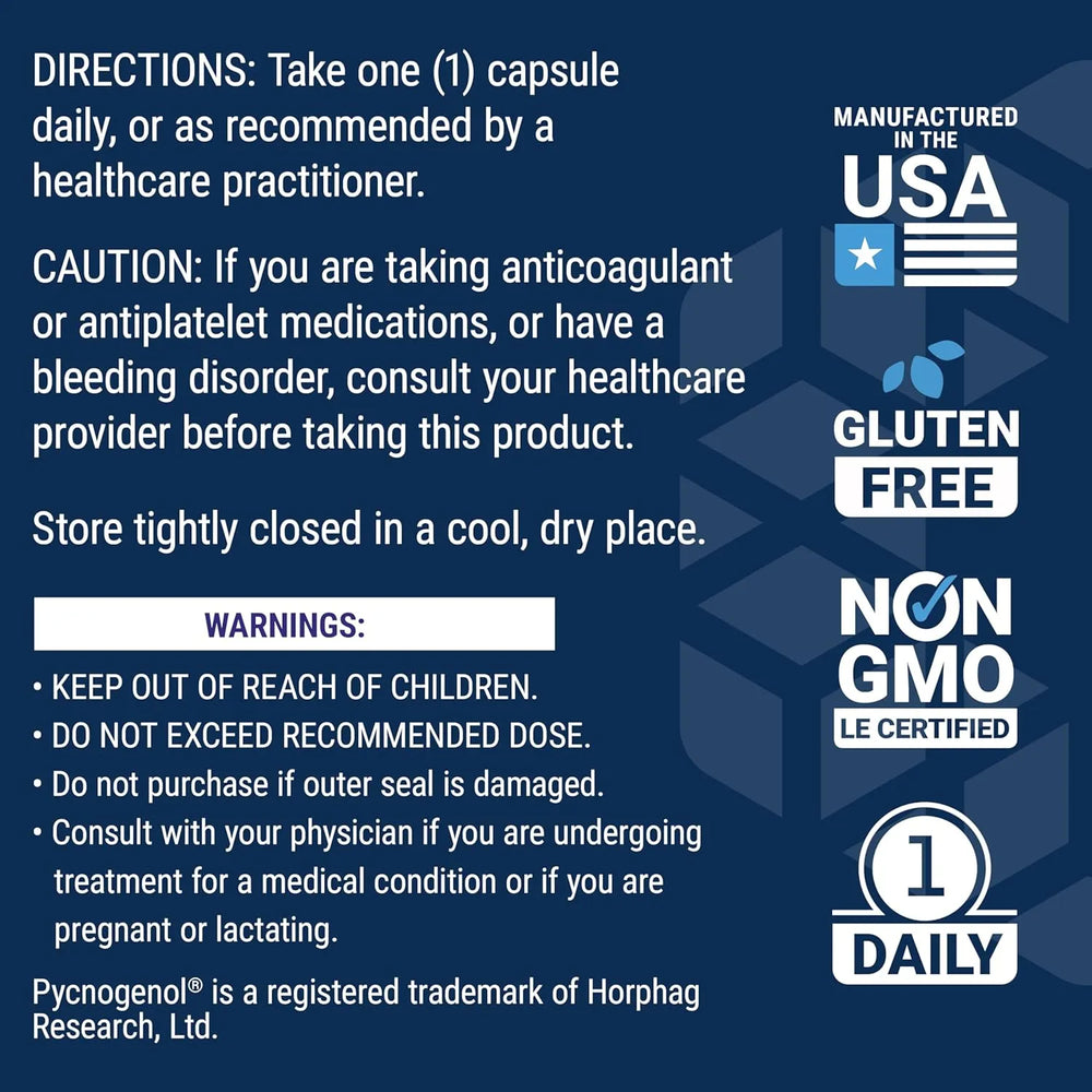 Mantiene una circulación sanguínea saludable: Esta fórmula incluye Pycnogenol, un extracto de corteza de pino marítimo francés. El Pycnogenol promueve la salud circulatoria al inhibir el estrés oxidativo y estimula la producción de óxido nítrico, lo que ayuda a mantener la circulación arterial.