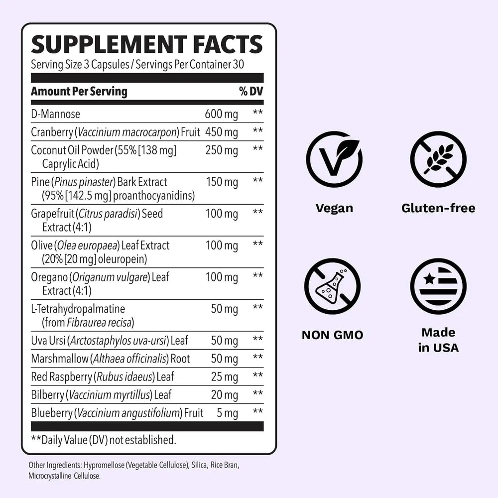 Ingredientes clínicamente probados: Elaborado con ingredientes totalmente naturales como arándano rojo, D-manosa, corteza de pino, L-tetrahidropalmatina, uva ursi, extracto de semilla de pomelo, orégano y ácido caprílico, que ayudan a promover la salud del tracto urinario y a aumentar los niveles saludables de microflora.
