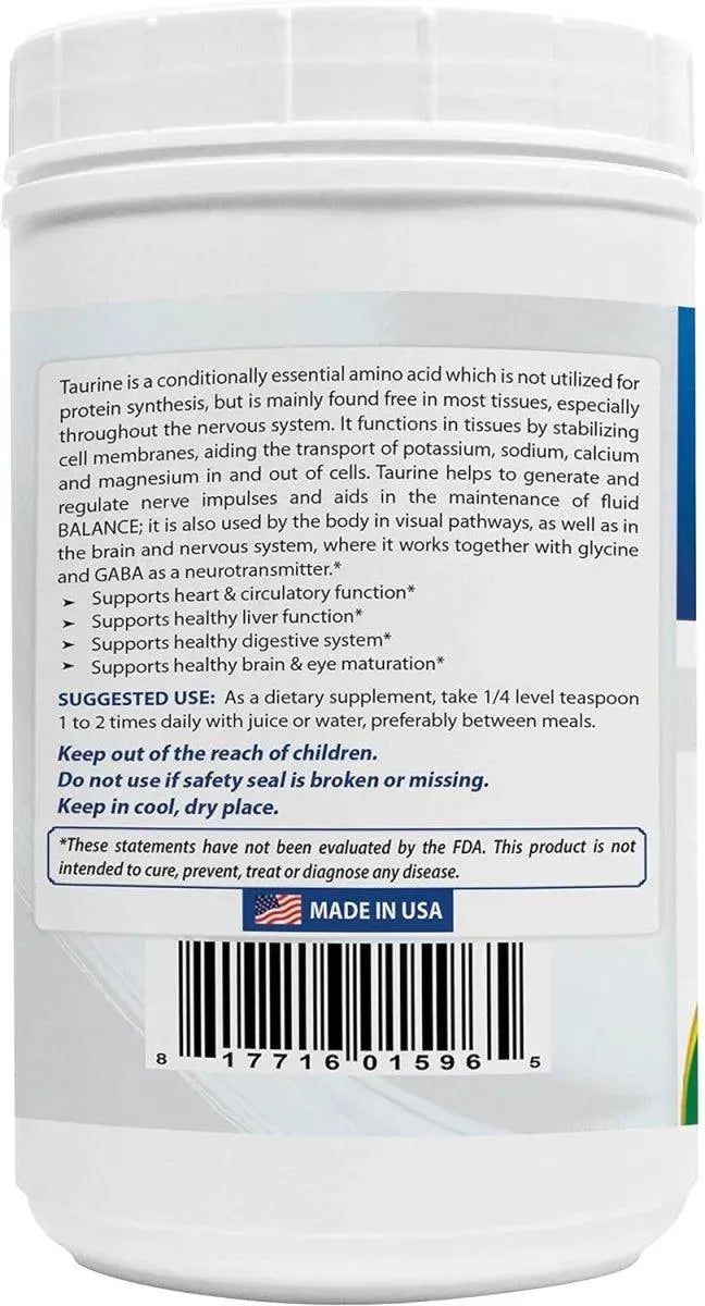 • ¼ de cucharadita rasa (1 g) de taurina por porción, 454 porciones por botella.