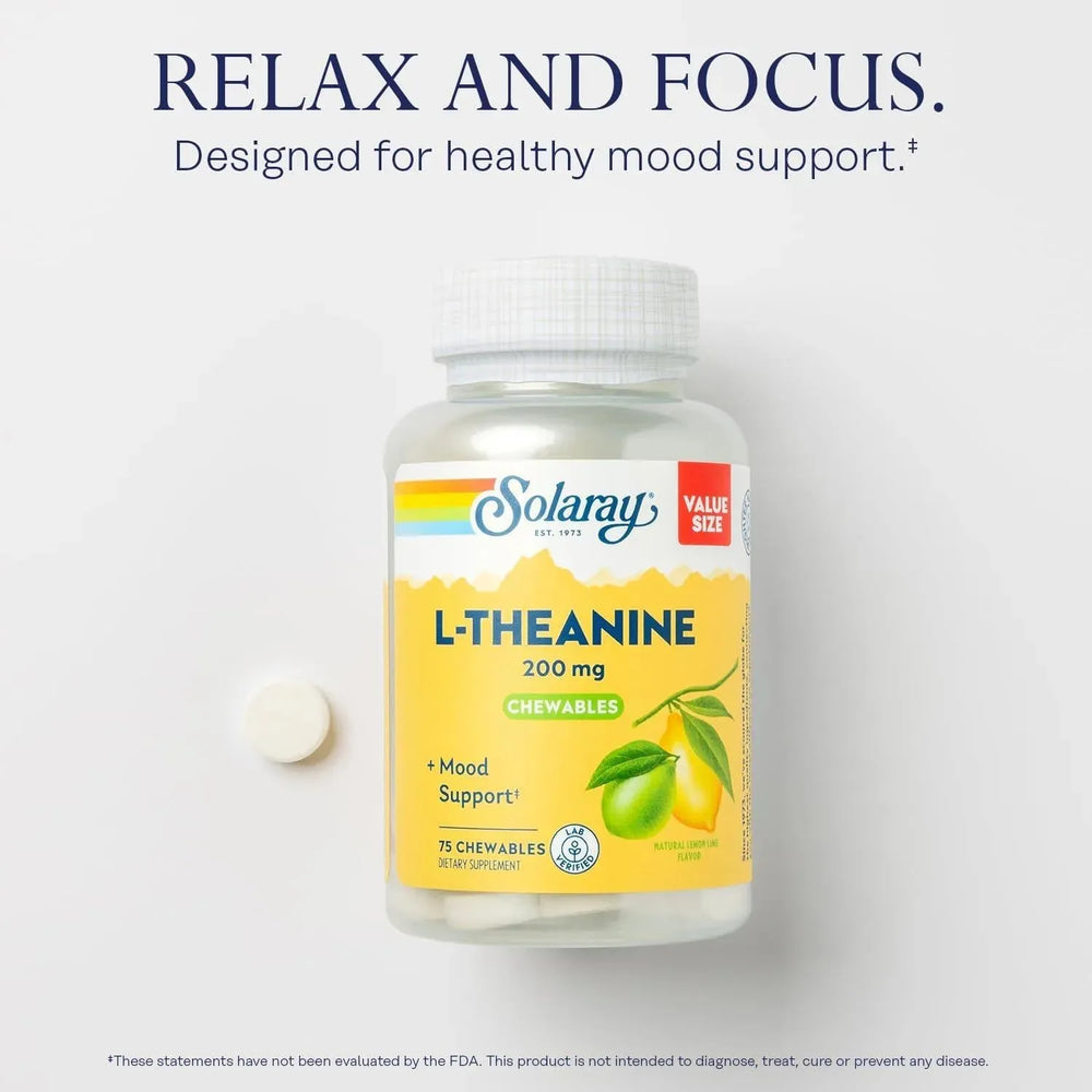 L-Teanina 200 mg: cada tableta masticable de Solaray L-Teanina contiene 200 mg de este aminoácido que puede brindar apoyo para la relajación en momentos de estrés ocasional sin causar somnolencia.