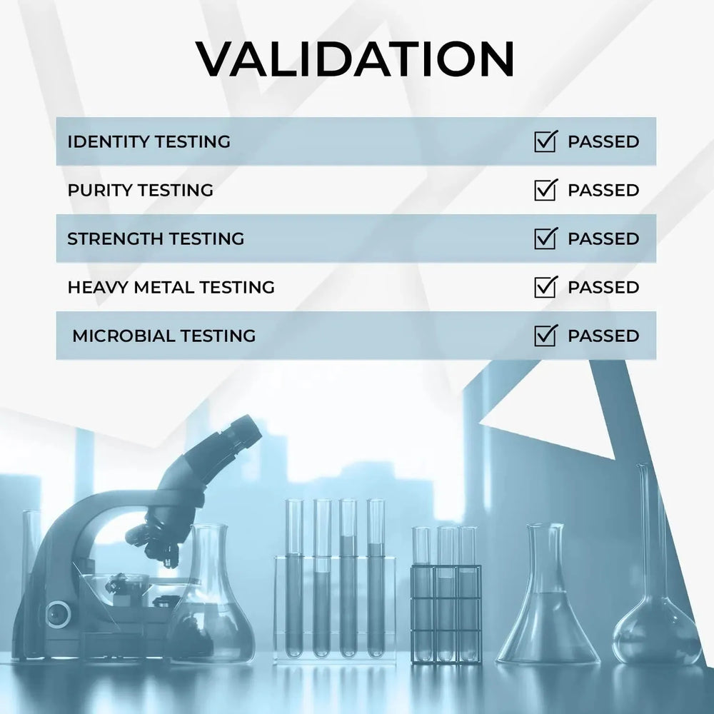 • PRUEBAS DE LABORATORIO INTERNO PARA PUREZA E IDENTIDAD: Todos los polvos a granel son probados antes de su envasado y/o encapsulación por un químico analítico capacitado a tiempo completo.