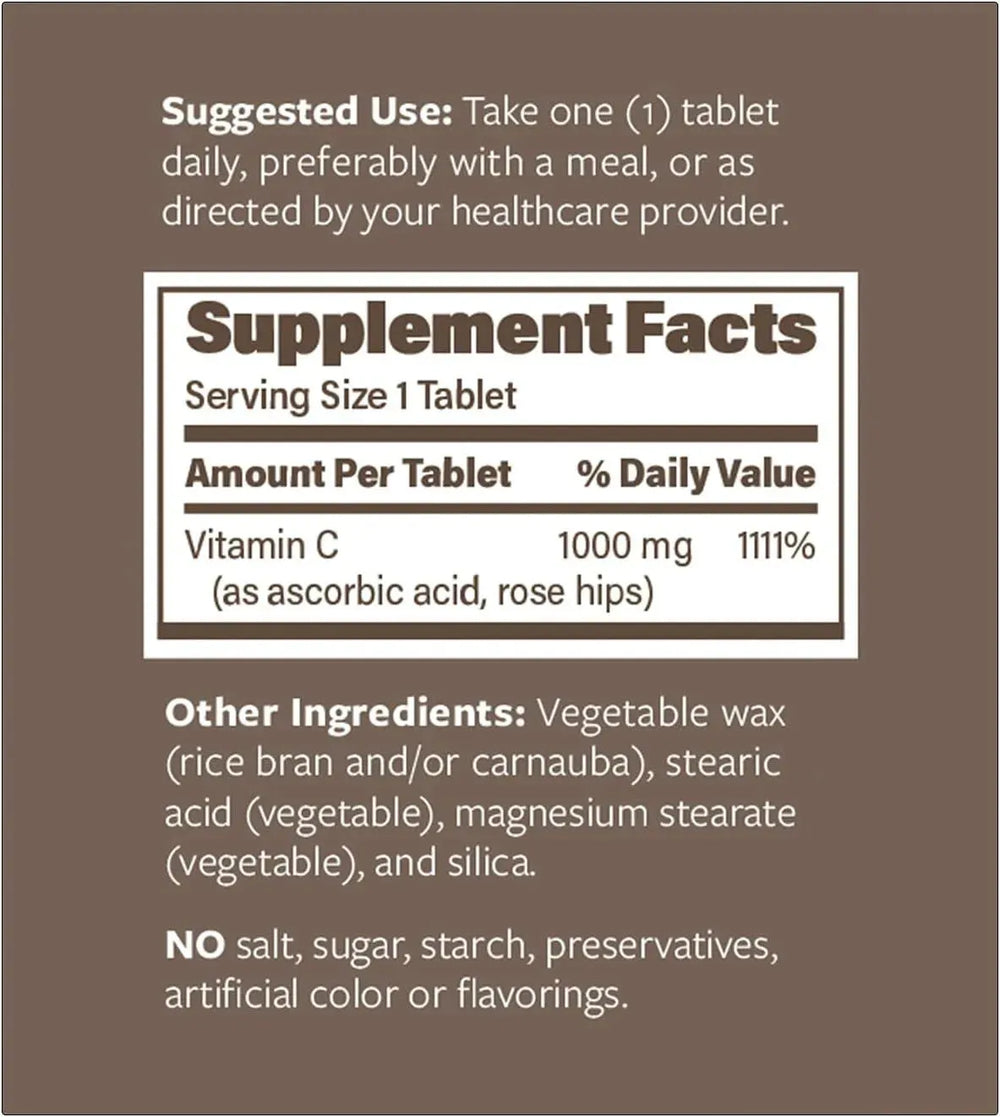 1000 mg de vitamina C de liberación sostenida con escaramujo: promueve vasos sanguíneos saludables, apoya la función inmune y promueve la piel y los nervios saludables.