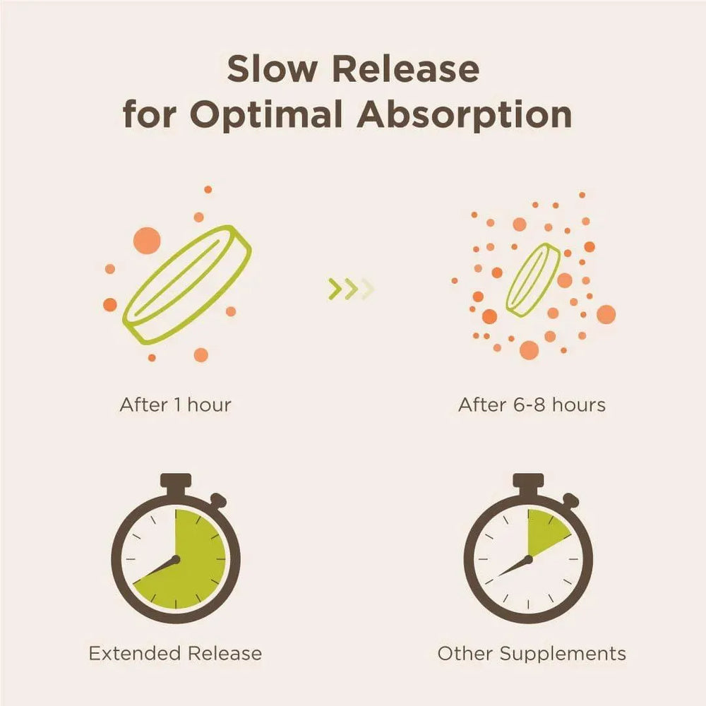 • LIBERACIÓN SOSTENIDA DE 5 A 7 HORAS: Nuestra tecnología única de tabletas de liberación prolongada se derrite a la temperatura del estómago para liberar vitamina C gradualmente durante 5 a 7 horas para una absorción óptima y una máxima efectividad.