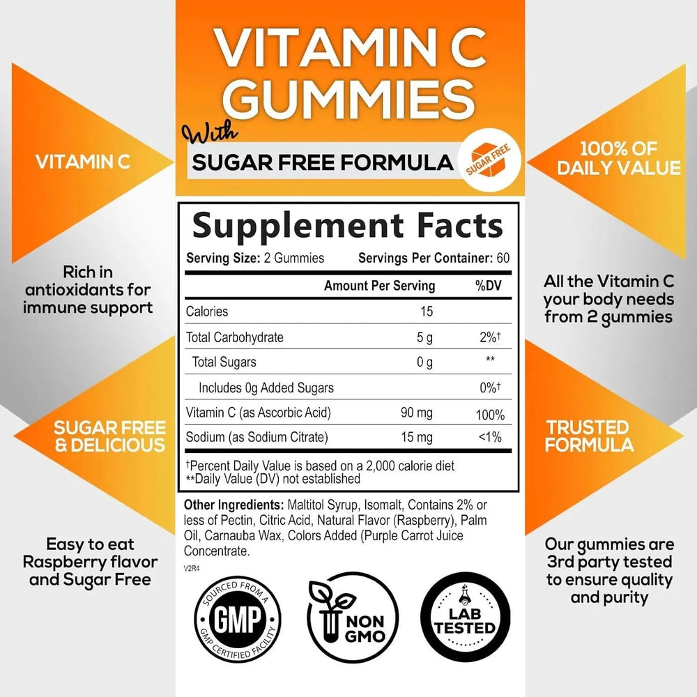 Calidad en la que puede confiar: nuestras gomitas de vitamina C no contienen OGM y cumplen con las pautas cGMP; La vitamina C sin azúcar ha sido sometida a pruebas exhaustivas de calidad y pureza.