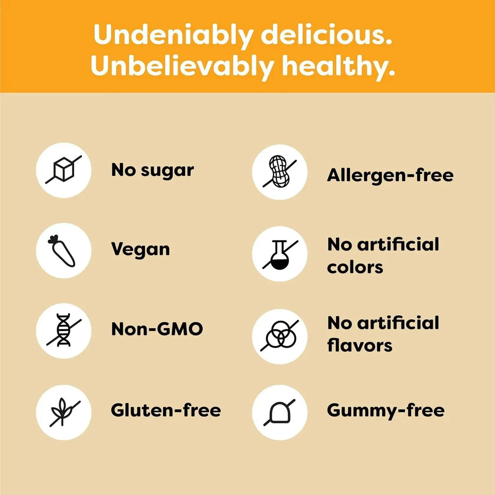 Elaboradas con sabores aprobados por niños e ingredientes limpios: estas tabletas derretidas vienen en un delicioso sabor a naranja Oh-Oh-Oh; Nuestra fórmula es vegana, sin OGM, sin azúcar, sin gluten, sin los 8 alérgenos comunes y sin colorantes ni sabores artificiales.