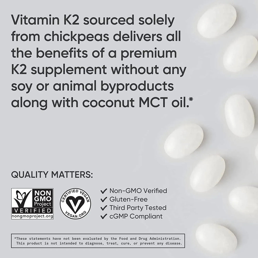 Basado en plantas | MenaQ7 Vitamina K2 certificada vegana, libre de soya, no verificada sin OGM, proveniente solo de garbanzos.