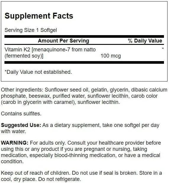 • FÓRMULA DE ALTA POTENCIA: El suplemento K2 de Swanson no solo respalda la salud de los huesos y el bienestar cardiovascular, sino que cada una de nuestras poderosas cápsulas blandas de vitaminas brinda 100 mcg de menaquinona-7 pura para lograr la máxima eficacia.