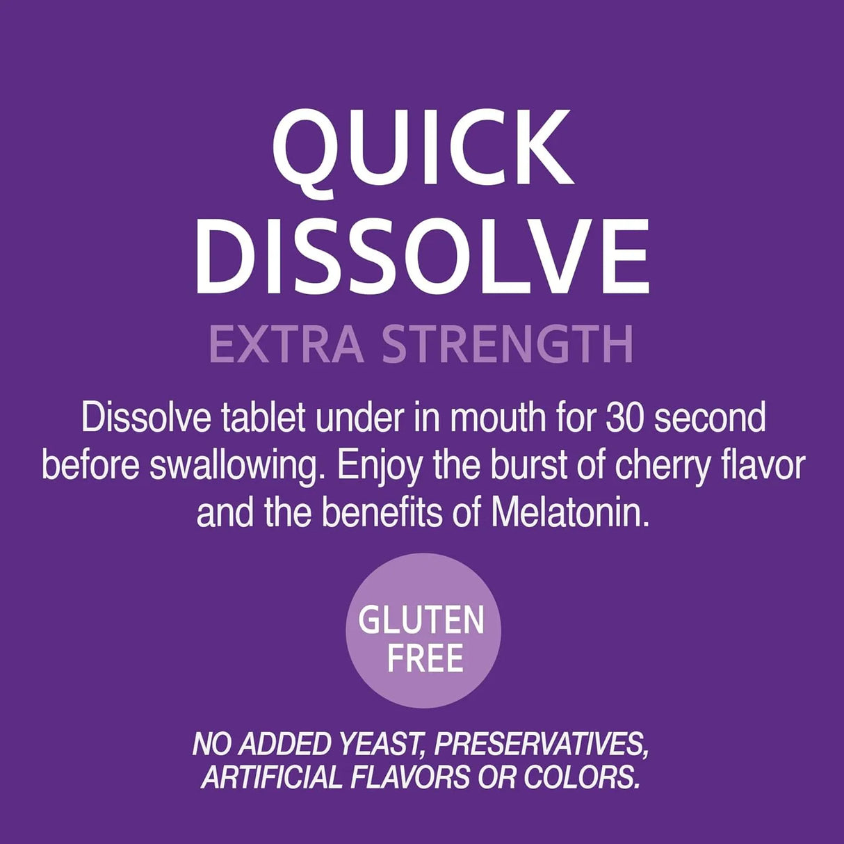 SUPLEMENTO PARA EL SUEÑO DE POTENCIA EXTRA: Disfrute de la fórmula de disolución rápida que actúa rápidamente para favorecer un buen descanso nocturno. Con un agradable sabor a cereza, se disuelve debajo de la lengua para una rápida absorción, una excelente opción para usar todas las noches sin agua.