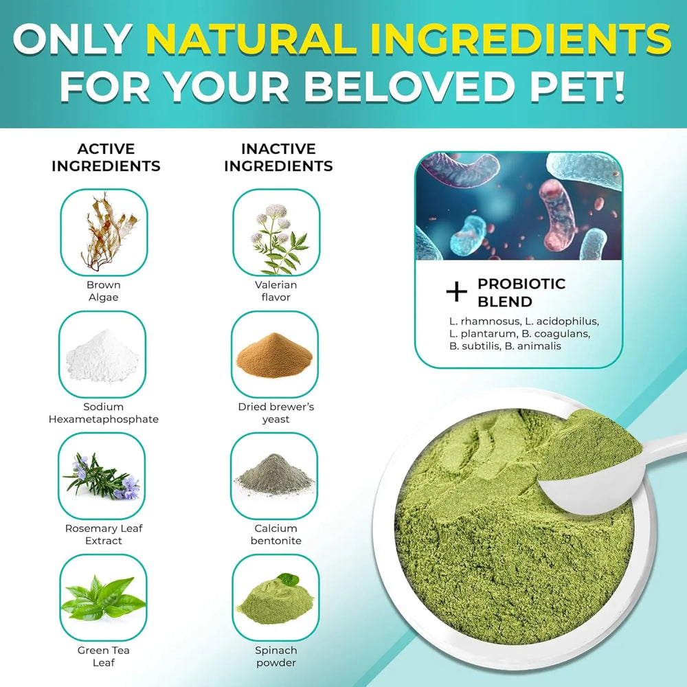 Las algas pardas, el hexametafosfato de sodio, el extracto de hoja de romero y otros ingredientes cumplen su función de forma eficaz. También ofrecemos sabor a valeriana para atraer el paladar de su perro.
