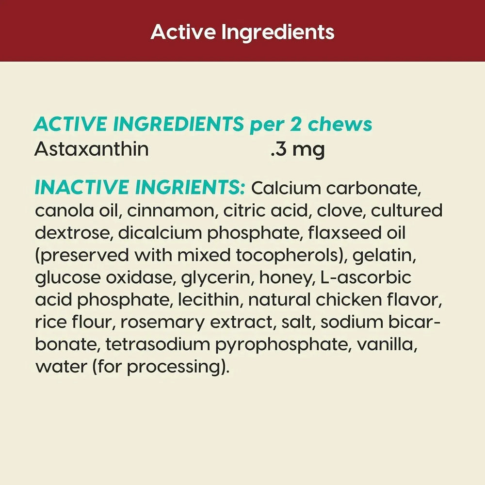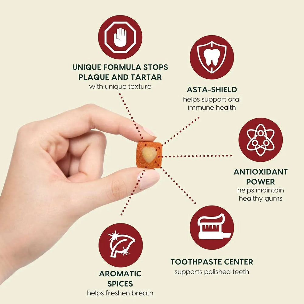 PREVIENE LA PLACA Y EL TARTAR Y REFRESCA EL ALIENTO: La masticación exterior está impulsada por astaxantina, el antioxidante más poderoso de la naturaleza, para detener la placa y el sarro antes de que puedan comenzar creando una barrera protectora en los dientes. El centro de pasta de dientes pule los dientes y ayuda a combatir el mal aliento con ingredientes naturales como canela, vainilla y clavo.