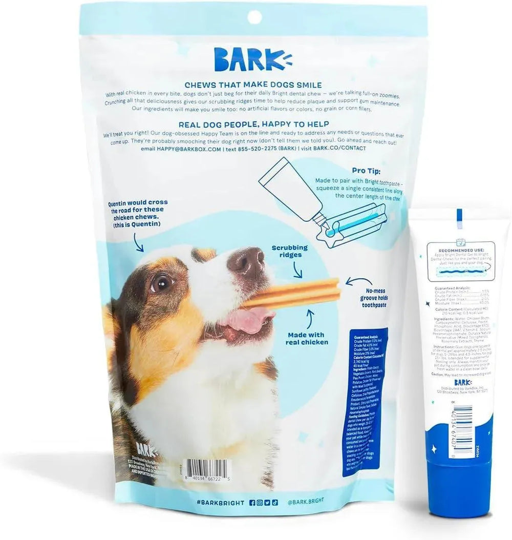 Irresistiblemente delicioso: Sumérgete en la experiencia refrescante del aliento para perros Bright con los palitos masticables dentales y el gel BarkBox, enriquecidos con sabores de pollo y tomillo. Tu perro no podrá resistirse a la sabrosa combinación que hace que el tratamiento dental sea placentero