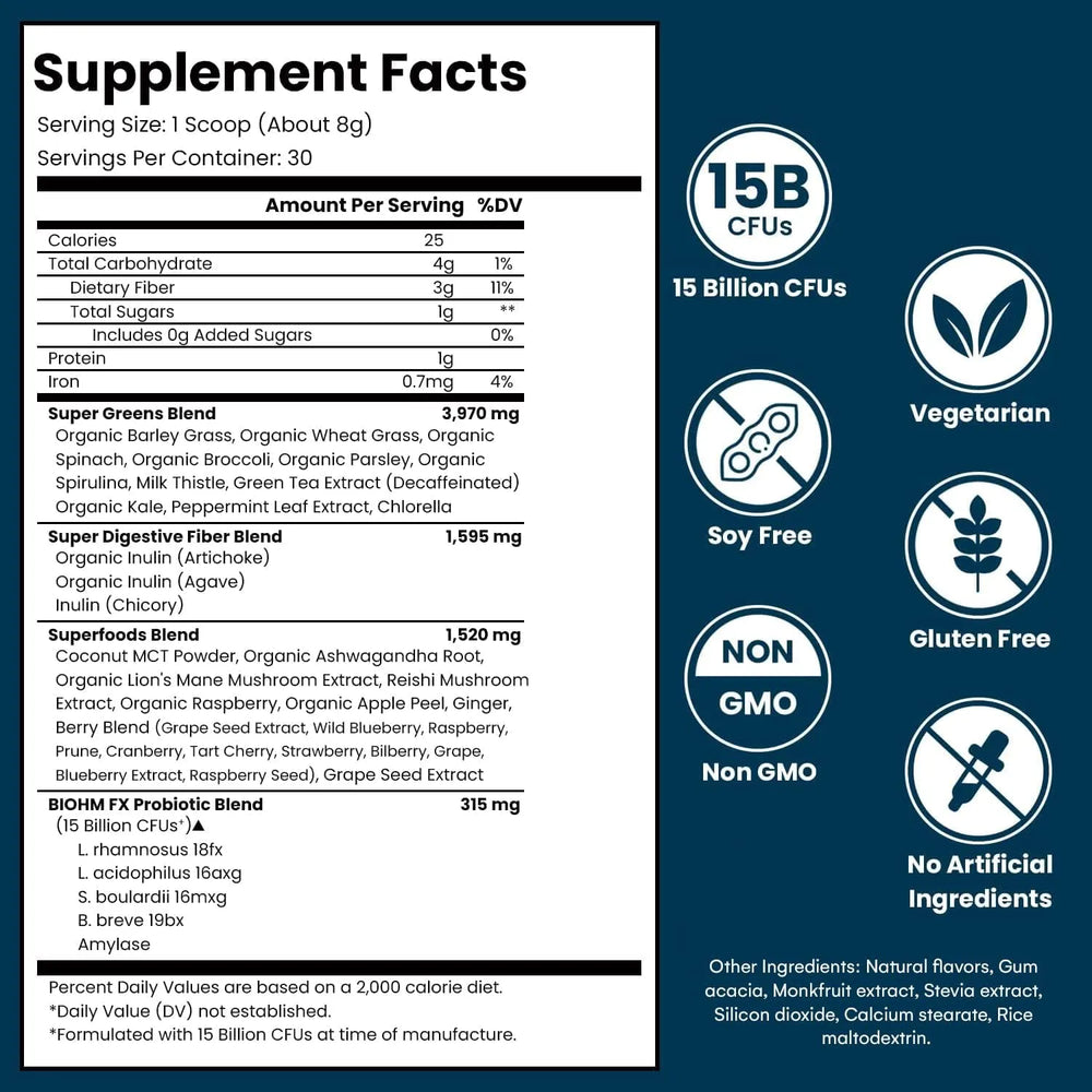 POLVO DE VERDURAS CON INGREDIENTES NATURALES: el suplemento en polvo Super Greens de BIOHM se obtiene de forma natural con 34 superalimentos, combinados con probióticos, prebióticos y enzimas saludables. ¡Bébalo con agua o agréguelo a su bebida favorita para obtener un refuerzo de polvo Super Greens!