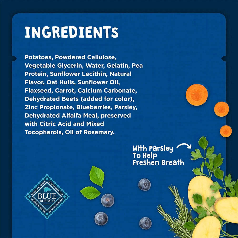 INGREDIENTES SALUDABLES Y COMPLETOS: Las golosinas para perros Blue Buffalo no contienen harinas de subproductos de pollo (ni aves), ni maíz, trigo ni soya.