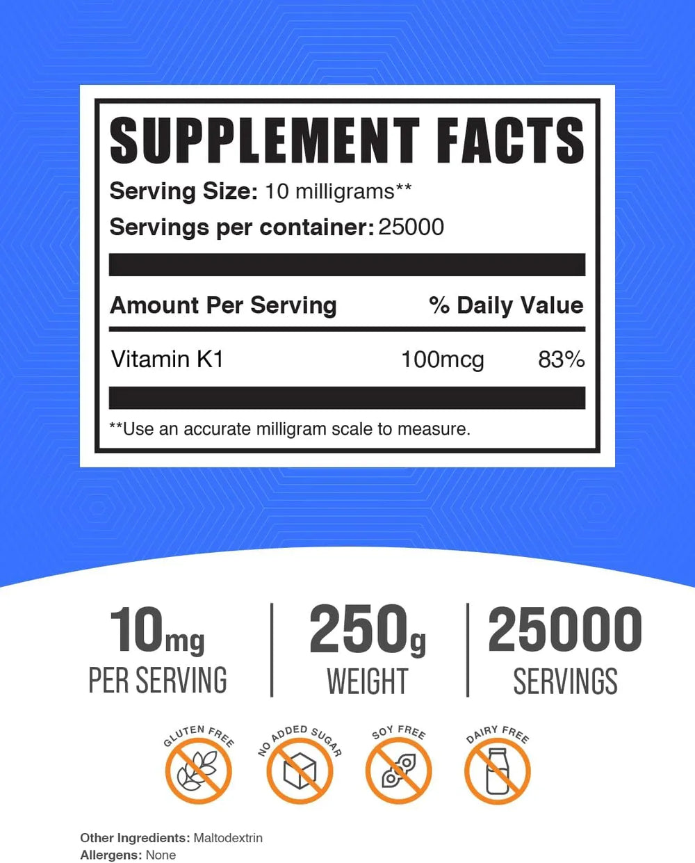 Favorece la salud y el bienestar general: Los beneficios de la vitamina K1 para fortalecer los huesos, promover el cerebro y el corazón, y apoyar la salud cardíaca, la convierten en un excelente suplemento integral para la salud general. Sentirse bien y saludable es incomparable. Mantén tu cuerpo sano nutriéndolo con nuestra vitamina K1 en polvo. Está 100 % libre de aditivos, sabores artificiales y rellenos, así que puedes sentirte seguro de lo que ingieres.
