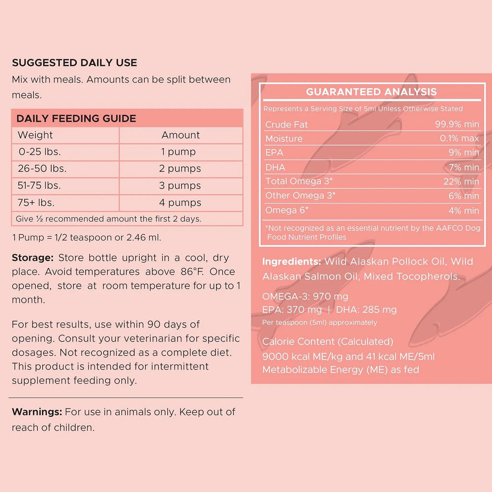 ¡Este aceite de pescado para perros está diseñado para perros pequeños, grandes e incluso de razas grandes! ¡El aceite le aporta un delicioso sabor que a su mascota le encantará! La dosis recomendada varía según el tamaño del animal; consulte el envase.