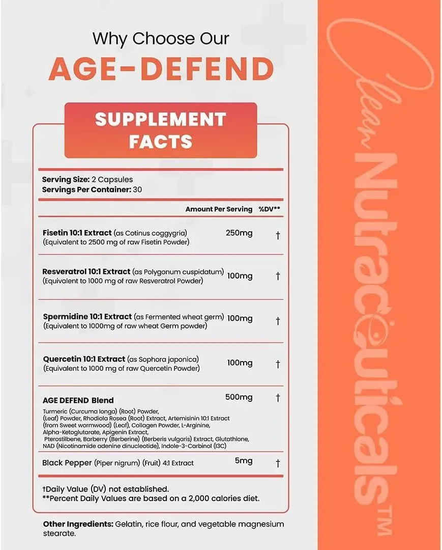 Complejo suplementario Age Defend de Clean Nutra: nuestro complejo de defensa contra la edad 16 en 1 viene repleto de los ingredientes más esenciales necesarios para la longevidad y el bienestar en nuestros últimos años.