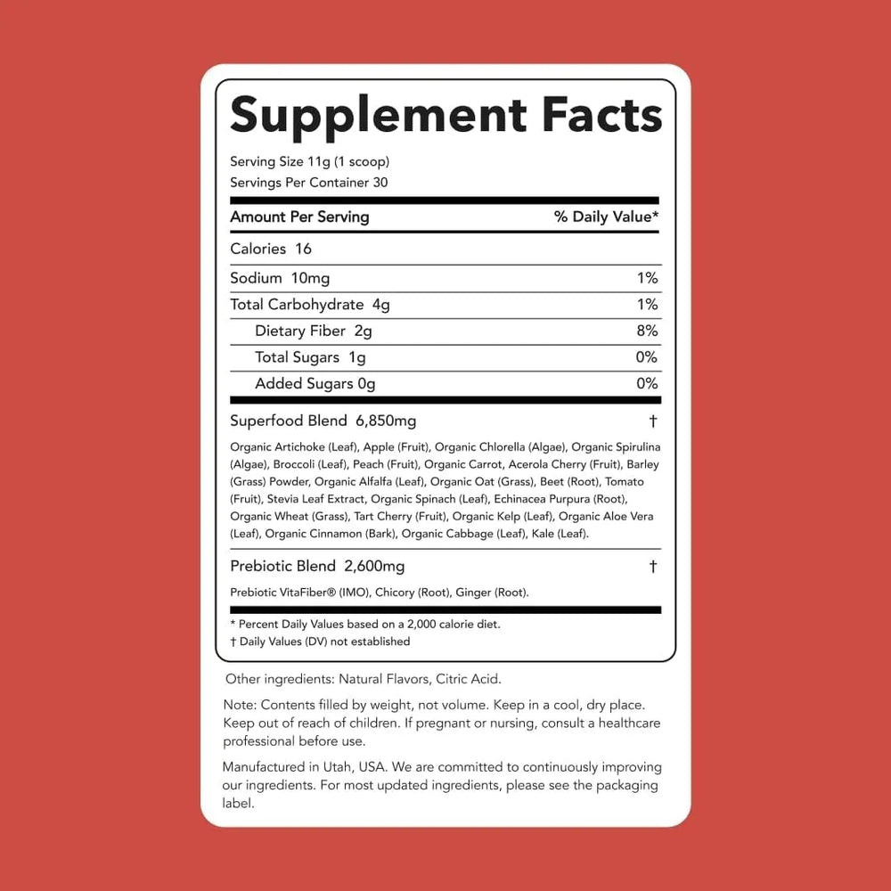 AUMENTA TU CONSUMO DE VEGETALES: Con 20 verduras, hierbas, frutas y algas diferentes, ¡tienes todos tus superalimentos verdes en una sola porción! Estos son los superalimentos que necesitas pero que no sueles consumir, como la clorella orgánica y la espirulina.