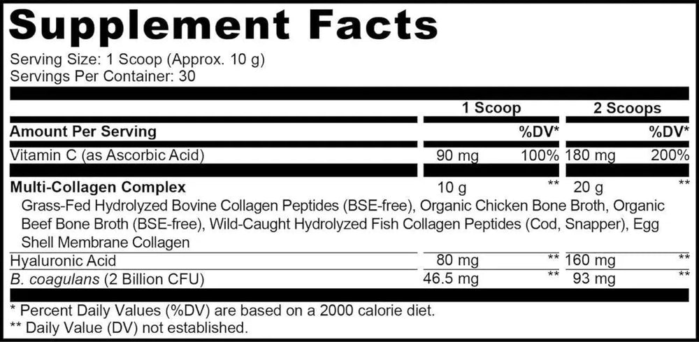 Suplemento de probióticos en polvo: Codeage Multi Collagen Black Edition también ofrece probióticos con B. coagulans, una cepa probiótica estable en almacenamiento con 2 mil millones de UFC* de microorganismos para combinar una fórmula avanzada de colágeno hidrolizado en polvo con un suplemento intestinal probiótico.