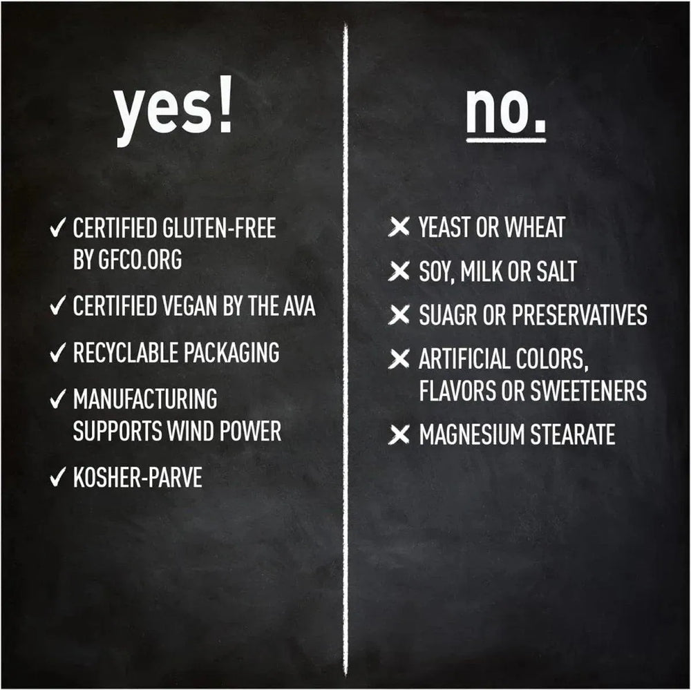 Elaborado de forma responsable: certificado sin gluten, vegano y kosher, elaborado con envases reciclables, la fabricación de este producto respalda la energía eólica. Este producto no contiene levadura, maíz, trigo, soja, leche, conservantes ni colorantes, saborizantes ni edulcorantes artificiales.