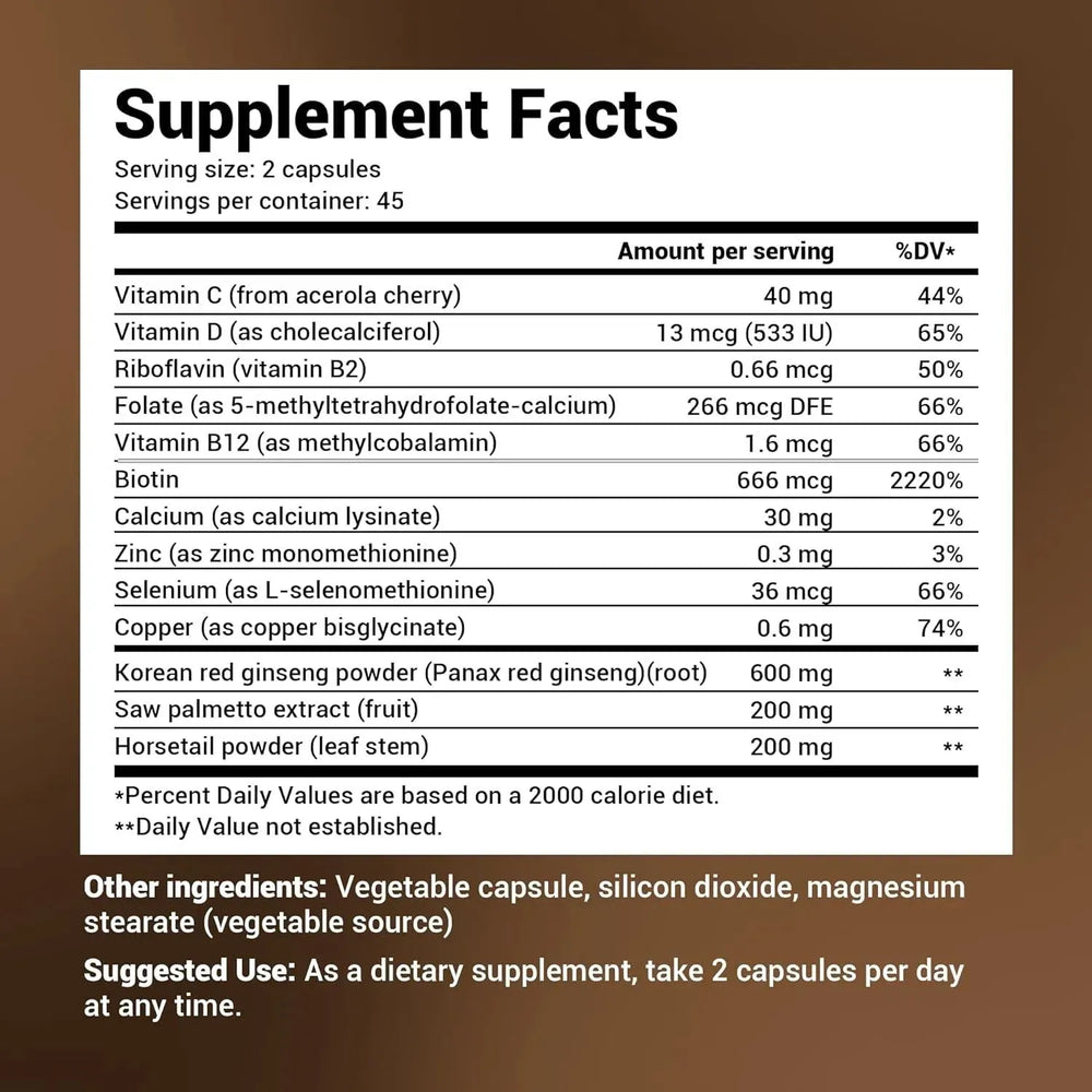 Hecho para hombres y mujeres, este suplemento para el cabello está repleto de vitaminas naturales como zinc, cobre, vitaminas C, D3, B2, B12, calcio, selenio y más. Mejorado con ingredientes especiales como biotina, palma enana americana, polvo de hierba de cola de caballo y ginseng rojo coreano. Suministro de 45 días