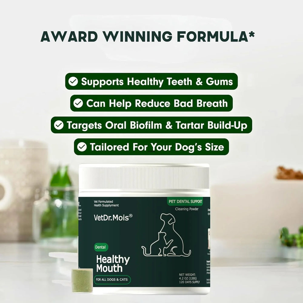 Cuidado dental para perros y gatos: El polvo dental Dr. Mois para la eliminación de placa simplifica el cuidado bucal de tu mascota y resuelve la resistencia al cepillado. Con solo unas cucharadas al día, limpia fácilmente los dientes y soluciona los problemas de sarro y mal aliento.