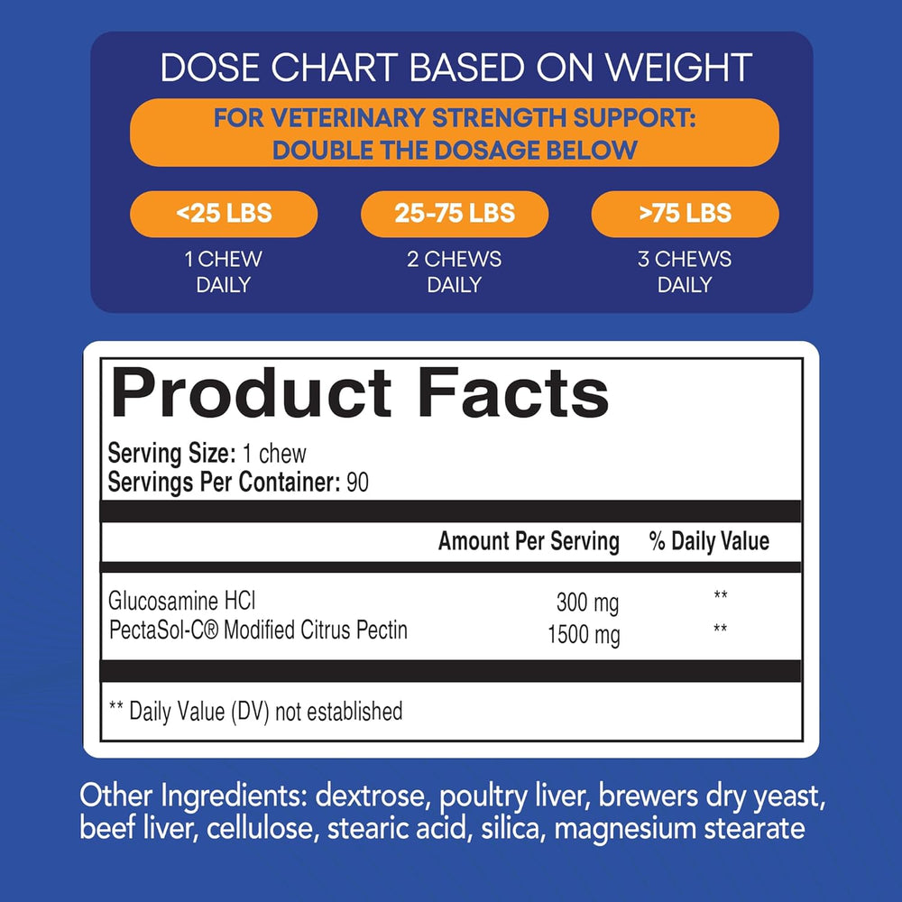 Ayuda a promover la salud y el bienestar a largo plazo: Un compañero confiable de grado veterinario para apoyar la salud y movilidad articular de tu mascota, las tabletas masticables PectaPaws contienen altas concentraciones de PectaSol Modified Citrus Pectina y Glucosamina HCI, dos supernutrientes clínicamente recomendados para perros de todas las edades y etapas de la vida, incluidas las razas grandes.