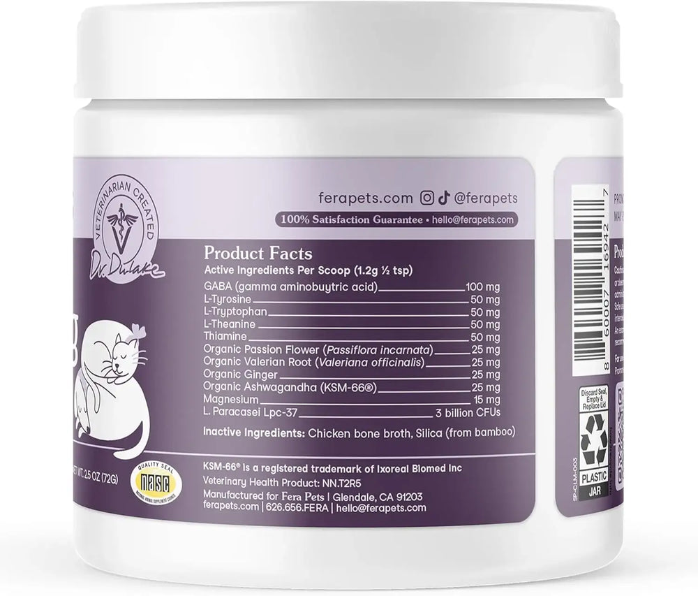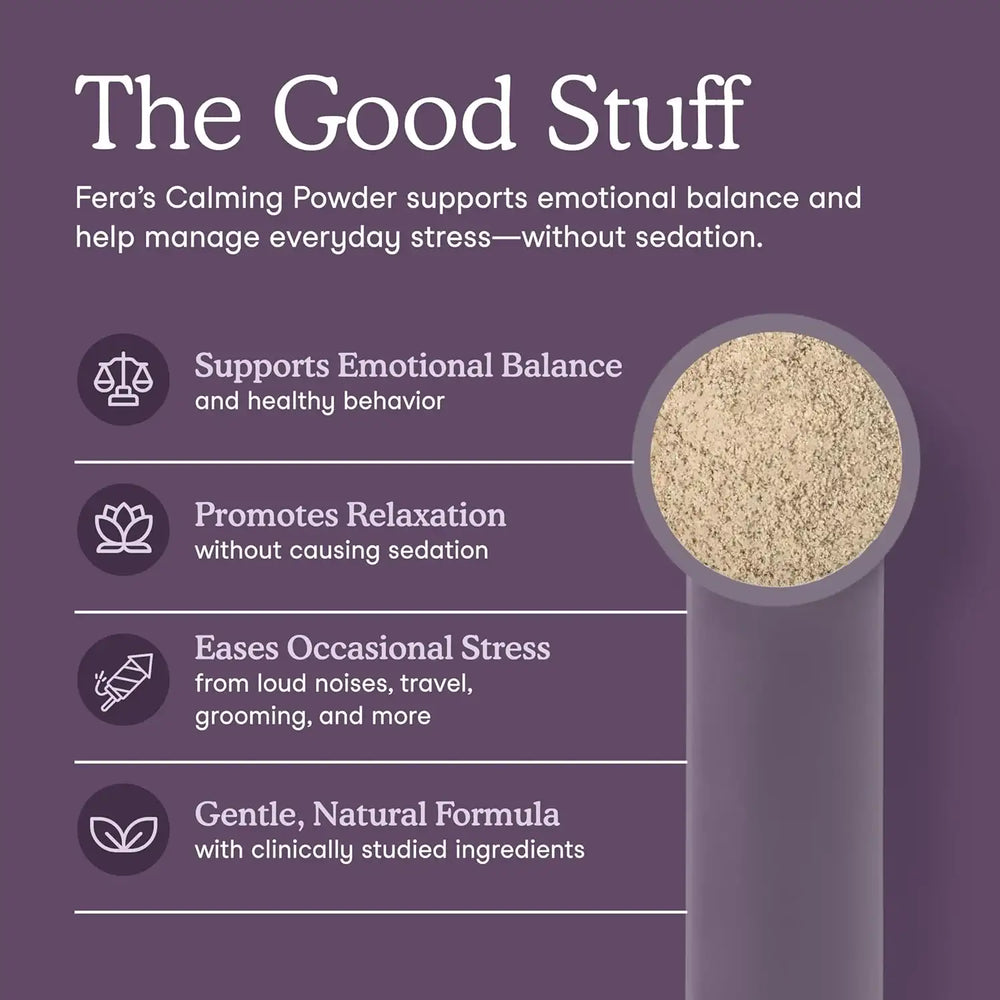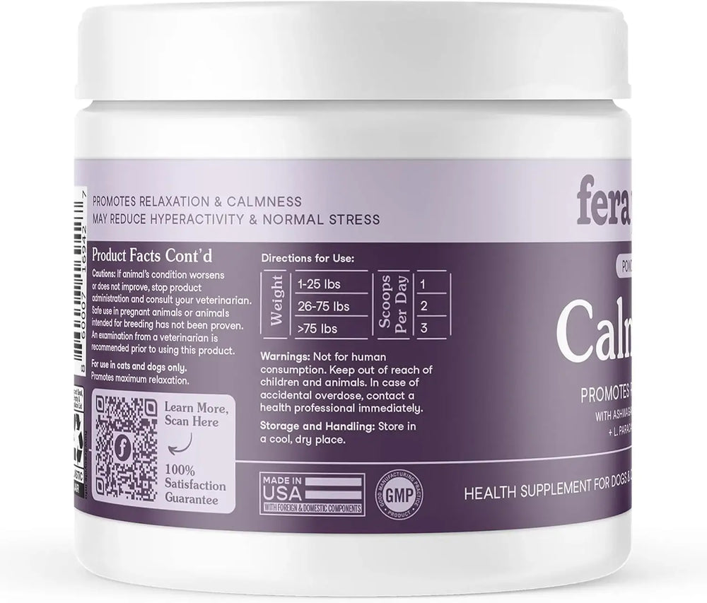 Relajación fácil para mascotas: El suplemento calmante Fera es una potente mezcla de ingredientes botánicos como ashwagandha, neurotransmisores y probióticos para perros y gatos, que les proporciona un estado de ánimo equilibrado.