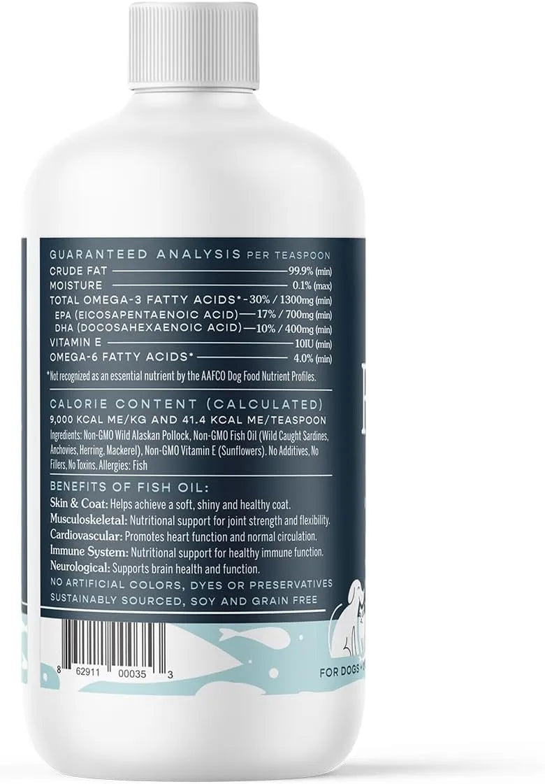 Guía de alimentación: Administre este aceite de pescado líquido como complemento a la comida de su perro o gato, añadiendo la cantidad recomendada a la comida de su perro o gato. 48 cucharaditas por botella de 8 onzas; para menores de 11.3 kg (25 lb), administrar ½ cucharadita; de 11.3 a 22.3 kg (25-50 lb), administrar 1 cucharadita; de 23.9 a 34 kg (51-75 lb), administrar 2 cucharaditas; consumir dentro de los 3 meses una vez abierto.