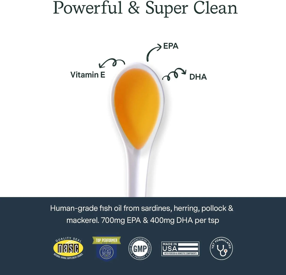 Fórmula veterinaria: Aceite de pescado para perros y gatos elaborado por nuestro cofundador, el veterinario Dr. Dulake. Nuestros suplementos de omega 3 de aceite de pescado cuentan con el sello de calidad NASC, se fabrican en EE. UU., cumplen con las normas de Buenas Prácticas de Manufactura (GMP) y se destilan molecularmente para eliminar todas las impurezas.