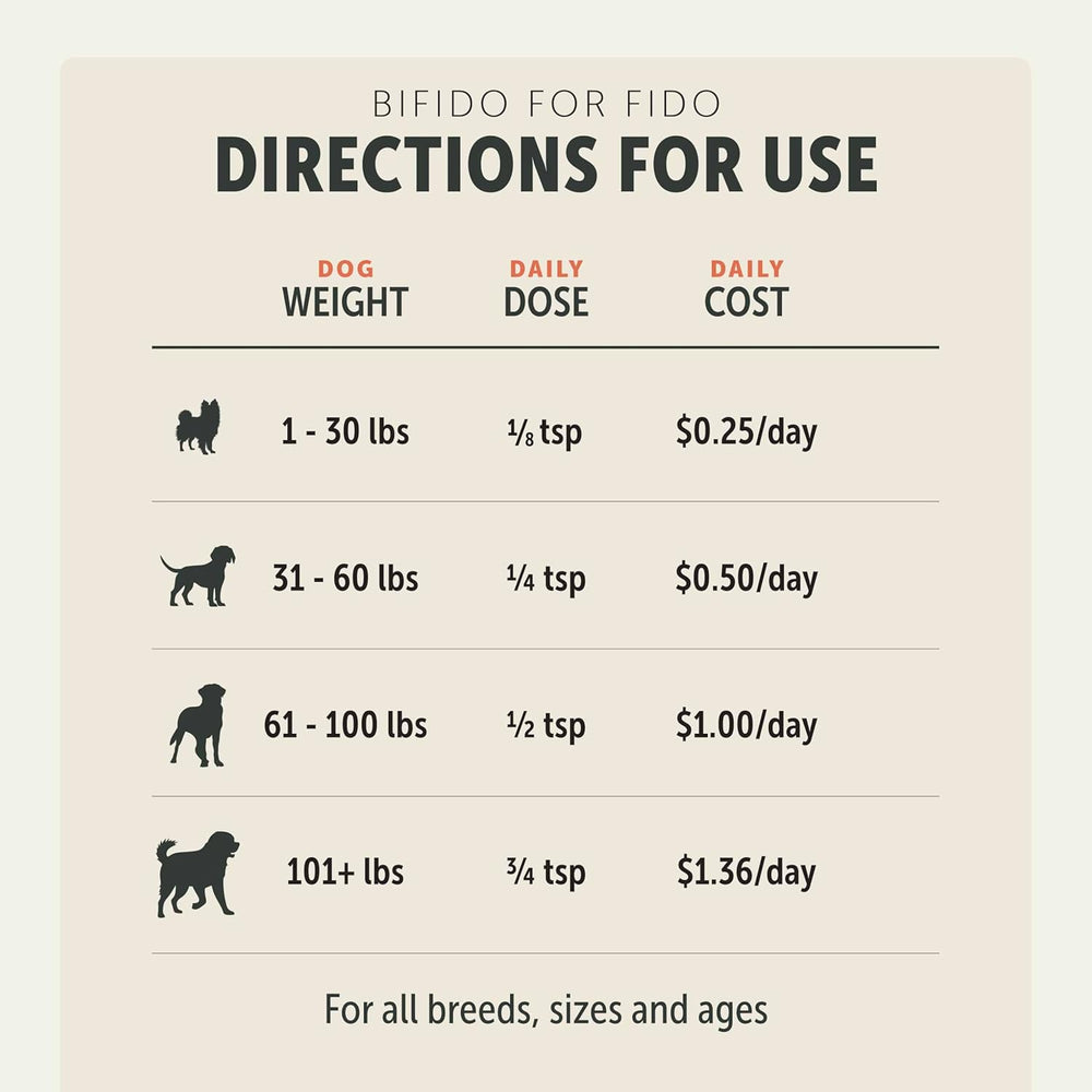 BIFIDO PARA FIDO: Diseñado para problemas intestinales. Una solución totalmente natural para heces blandas y problemas de salud intestinal. 50 mil millones de UFC, 13 cepas probióticas, seleccionadas por expertos para apoyar la flora intestinal y el sistema inmunitario de su perro.