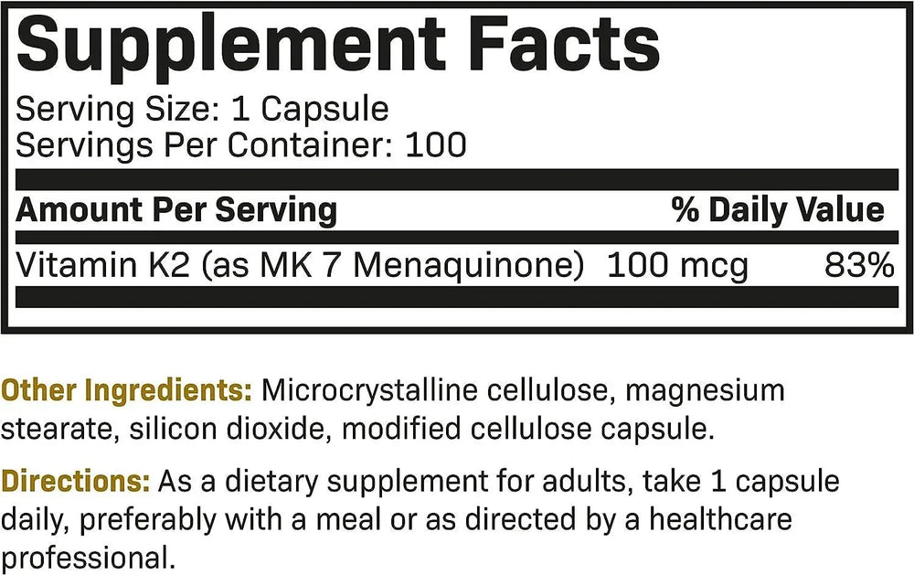 Vitamina K2 como MK-7: proporciona vitamina K2 como MK-7 para ayudar a dirigir el calcio del torrente sanguíneo a los huesos. Se ha demostrado que la vitamina K2 como MK-7 permanece biológicamente más activa en el cuerpo en comparación con otras formas de vitamina K para un apoyo superior.