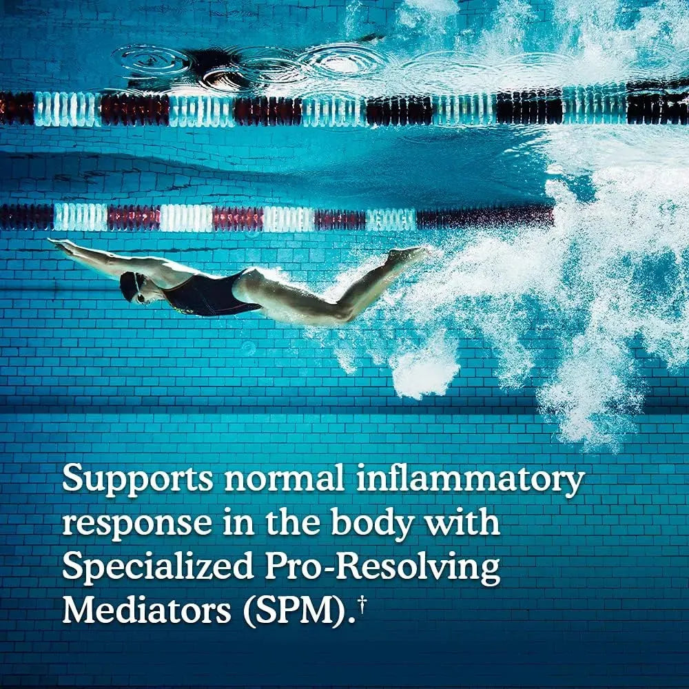 Suplemento de aceite de pescado Omega 3 formulado con más de 1000 mg de Omega-3 en total por porción y SPM, compuestos que apoyan las respuestas inflamatorias normales en el cuerpo