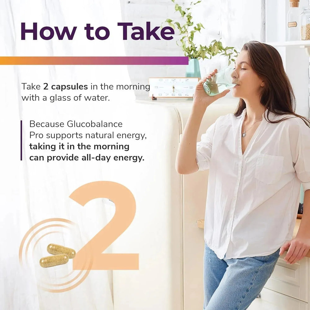 Cómo tomar: Para obtener mejores resultados, tome 2 cápsulas de este suplemento de glucosa por la mañana con un vaso de agua. Bright Naturals sugiere la mañana porque Glucobalance Pro apoya la producción de energía natural. Por lo tanto, tomarlo por la mañana puede aportar energía durante todo el día.