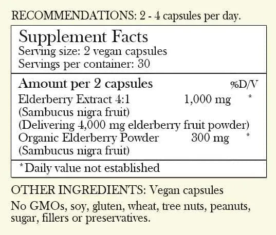 DATOS DEL SUPLEMENTO: Tamaño de la porción, 2 cápsulas, extracto concentrado de saúco 4:1 + polvo de saúco orgánico; 4300 mg por porción, 60 cápsulas por frasco