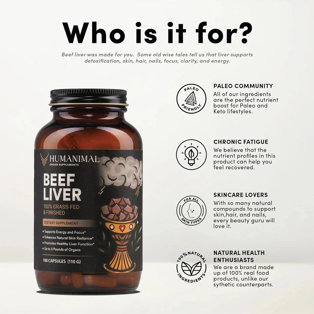 Nutrientes vitales extraídos de la sabiduría ancestral: los suplementos de hígado de res Humanimal están repletos de vitaminas, minerales, proteínas y grasas para brindar salud integral y beneficios para su cuerpo, incluida una mejor energía, concentración, brillo de la piel y función hepática.