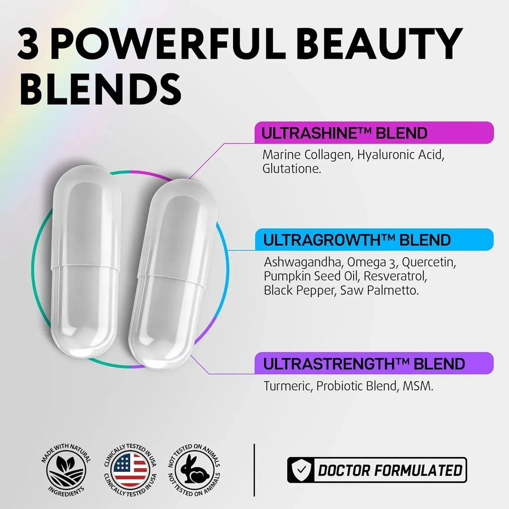 Vitaminas para el cabello todo en uno: con las vitaminas para el cabello UltraBlend para un crecimiento del cabello más grueso, no hay necesidad de obtener suplementos de ashwagandha, suplementos de ácidos grasos omega 3, suplementos de resveratrol, probióticos para mujeres, gomitas de biotina o complejo de magnesio por separado. Nuestras vitaminas para el cabello, la piel y las uñas para mujeres y hombres están repletas de vitamina D3 K2, vitamina B, vitamina K, cúrcuma, quercetina, calcio, omega 3, selenio, cúrcuma, curcumina, yodo, palma enana americana y cápsulas de vitamina E.