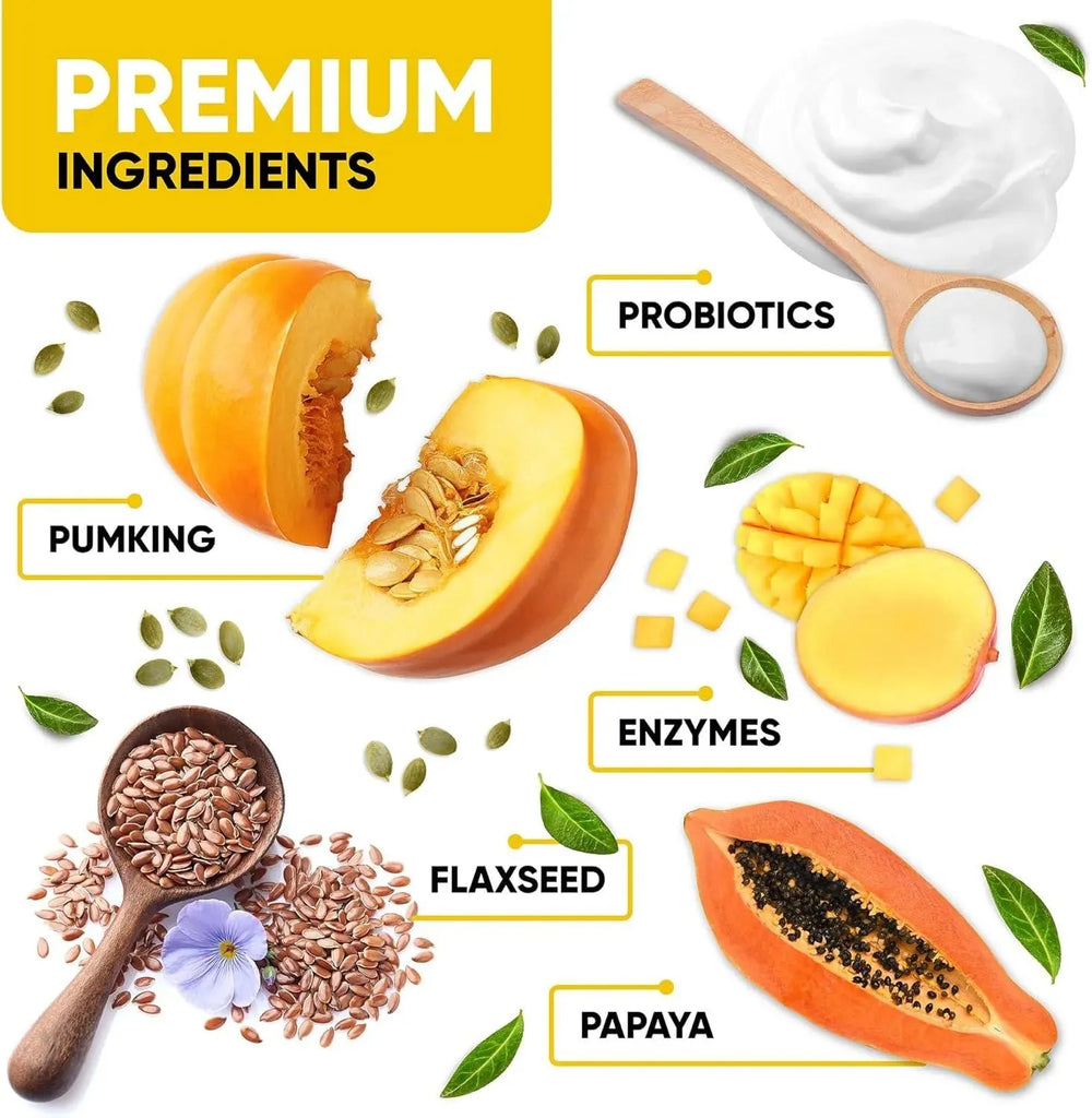 Mezcla eficaz: elaborado con papaya natural, calabaza y enzimas digestivas para perros, nuestros masticables probióticos para perros ayudan a su perro a absorber y utilizar más nutrientes de su comida. Apoyan una inmunidad fuerte y la salud en general.