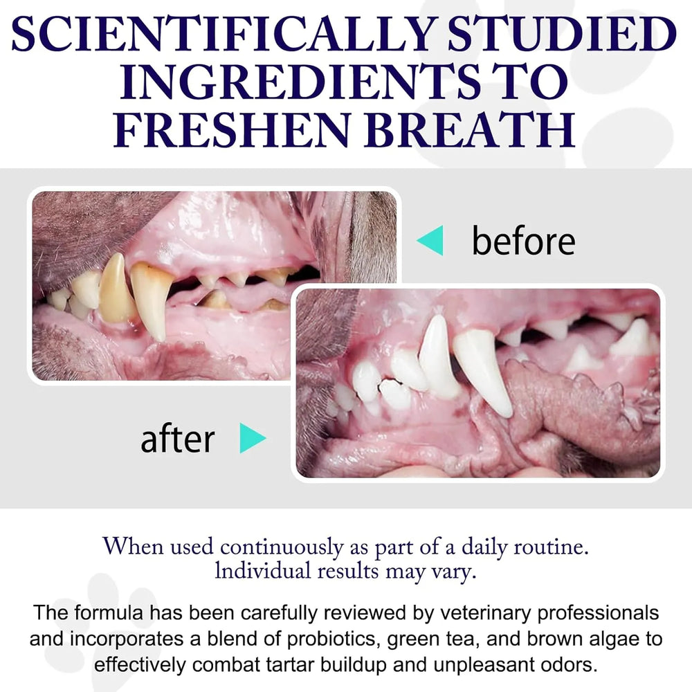 Cuidado dental de última generación: el polvo limpiador dental contiene una mezcla patentada de probióticos que revoluciona el cuidado bucal de los perros. Dile adiós a las molestias de la pasta de dientes, el cepillado y los palillos dentales con nuestro polvo dental para perros de una sola cucharada, revisado por veterinarios.